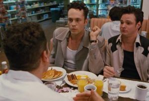 For some inexplicable reason there was a swing revival in the mid 1990s and Swingers was the benign and acceptable face of that trend that makes people forget about Brian Setzer and Lou Bega. There are actually two diner scenes in Swingers (hey, kids in the 40s loved diners) the second one, at the end of the film, is the “fun little baby games” where Vince Vaughn beclowns himself. But the first scene at the late night diner is why Vaughn, as obnoxious as he is funny, became famous (and why he’s never going to reach those heights again).